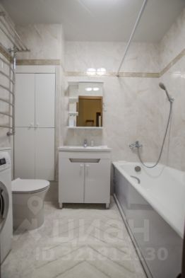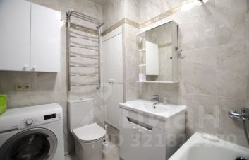Совмещенный просторный санузел с современной стиральной машиной, импортной сантехникой.