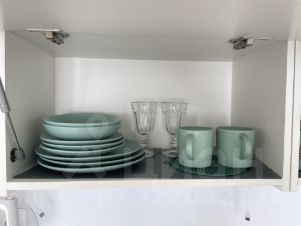 Кухня: холодильник, свч, плита, чайник и посуда для приготовления и приема пищи.