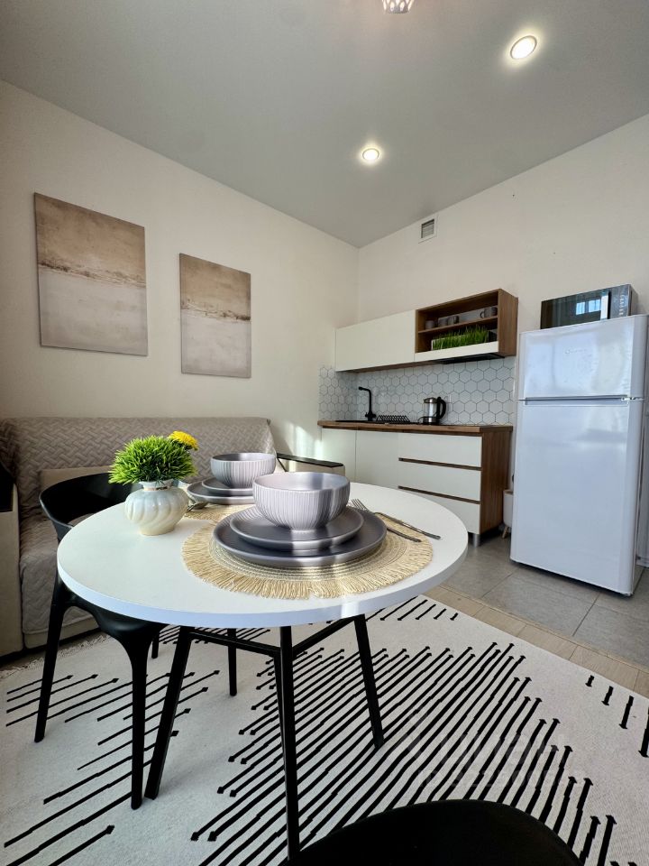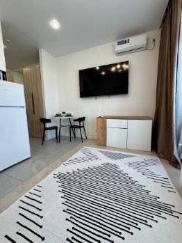 В комнате двуспальный диван с ортопедическим матрасом, огромный современный телевизор, комод-трансформер, обеденный стол и стулья.