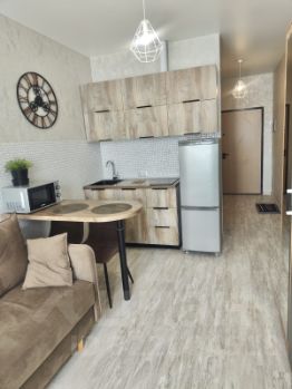 Выполнен дизайнерский ремонт с грамотным планировочным решением. Есть всё необходимое для комфортного проживания: кухонный гарнитур, холодильник двухкамерный, варочная панель, микроволновая печь, стиральная машина автомат, диван раскладной с местом для хранения, шкаф, большой смарт телевизор.