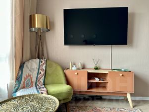 Гостиная зона встречает уютным креслом и диваном, а особый уют создает ковер и торшер с лампочкой Эдисона, за общую атмосферу отвечает 55" телевизор с WIFI. Вид из окна не оставит равнодушным, широкий простор и панорама, при этом сохранение приватности.