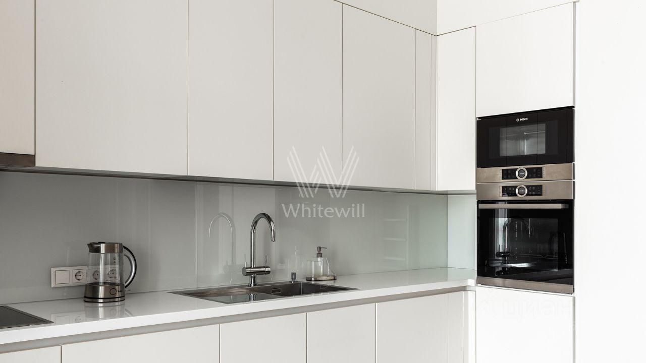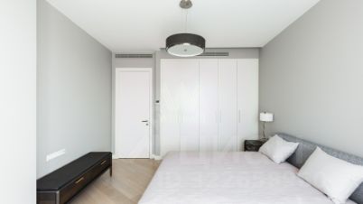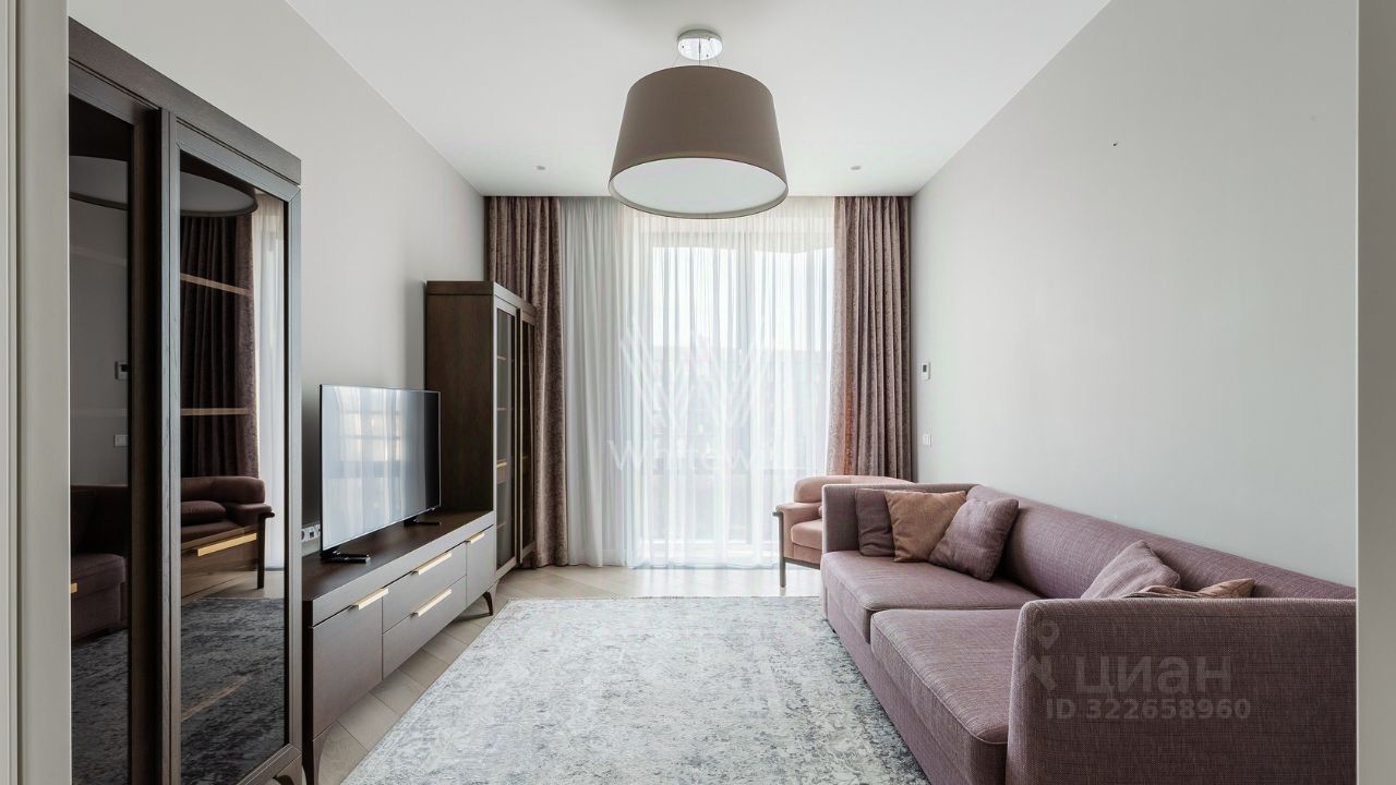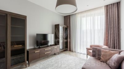 Квартира с одной спальней общей площадью 76 м² в комплексе премиум-класса "Сколково Парк" на седьмом этаже. Выполнена отделка в современном стиле в лаконичных светлых тонах. Благодаря панорамным окнам и высоким потолкам пространство наполнено естественным светом. Спланирована гостиная, кухня с обеденной зоной и выходом на застеклённую лоджию, спальня, ванная комната, гостевой санузел, гардеробная, прихожая. Квартира полностью меблирована и оборудована бытовой техникой. Из окон открывается вид в благоустроенный двор-парк.
