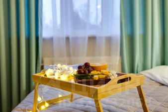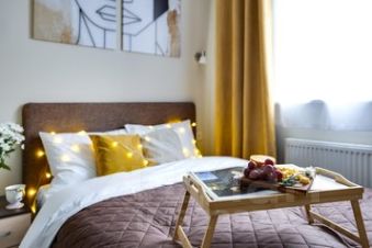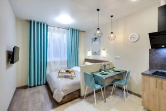 Апартаменты подходят для проживания до двух гостей. Установлена двуспальная кровать 160200 см с ортопедическим матрасом. Кухня оборудована индукционной варочной панелью, посудой и установлен фильтр для воды. Есть стиральная машина, фен, утюг, Smart TV и Wi-Fi. Окна оснащены шторами blackout.