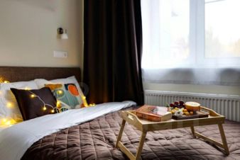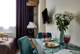 В распоряжении гостей двуспальная кровать 140 см 200 см с ортопедическим матрасом. Кухня оборудована индукционной варочной панелью, фильтром для воды, посудой. Имеются стиральная машина, фен, утюг, Smart TV, бесплатный Wi-Fi, шторы blackout. В наличии комплект полотенец, постельное бельё, шампунь, гель для душа, мыло, тапочки, приветственный набор — чай, кофе, сахар.