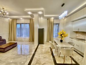 В квартире сделан новый евроремонт, а значит, вам будет комфортно и приятно находиться в ней. Удобная планировка включает две ванные комнаты — одна с ванной, другая с душевой кабиной. В квартире есть все необходимое для жизни: кондиционер, холодильник, посудомоечная машина, телевизор и стиральная машина. Мебель установлена как в кухне, так и в комнате, поэтому можно сразу заезжать и жить.