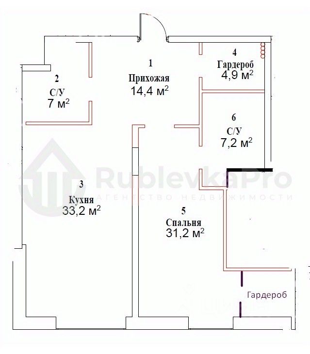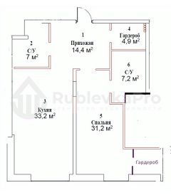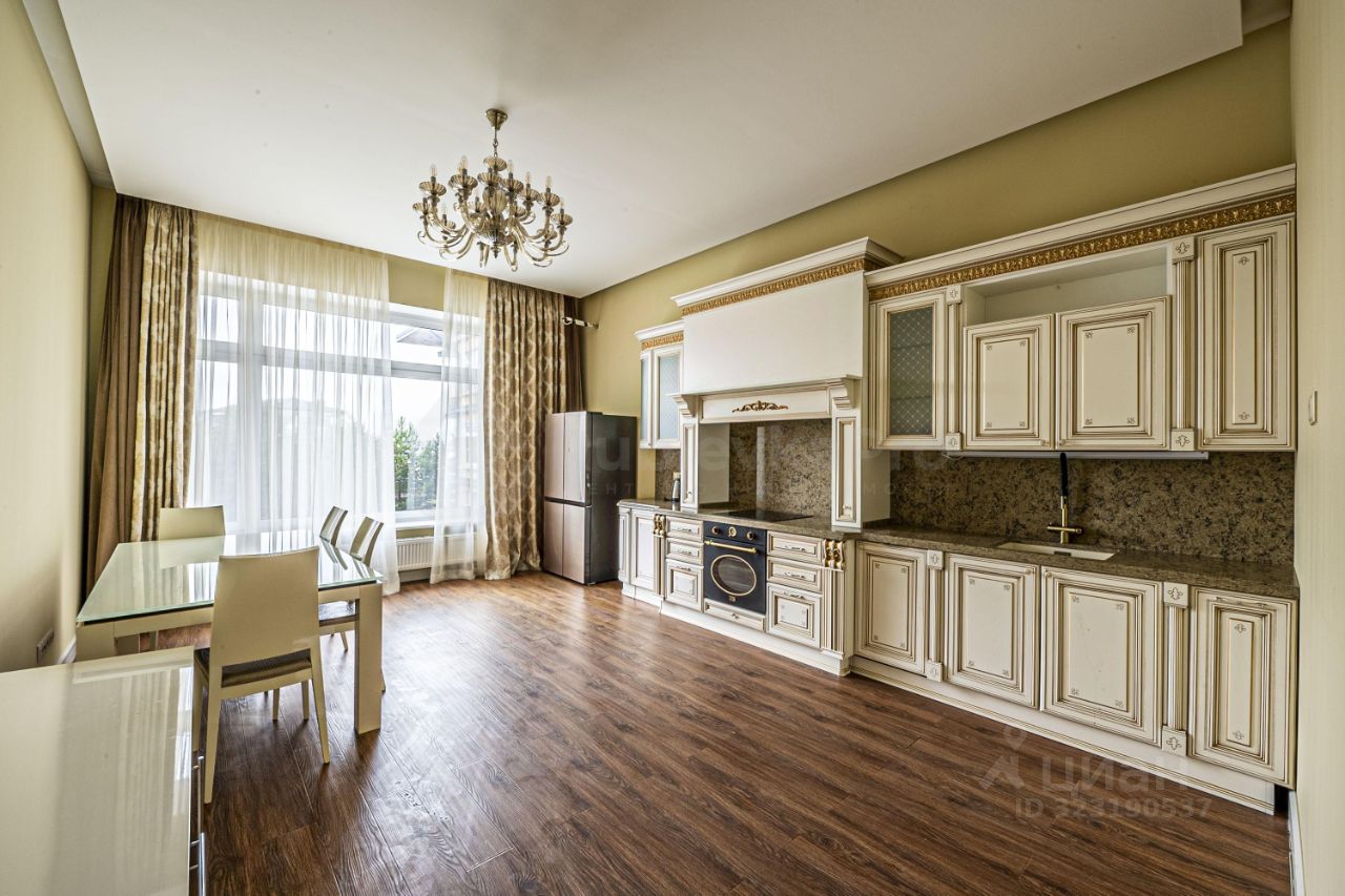 В квартире кухня-гостиная 33 м2, спальня 31 м2 со своим санузлом и гардеробной, прихожая с гостевым санузлом и гардеробной.