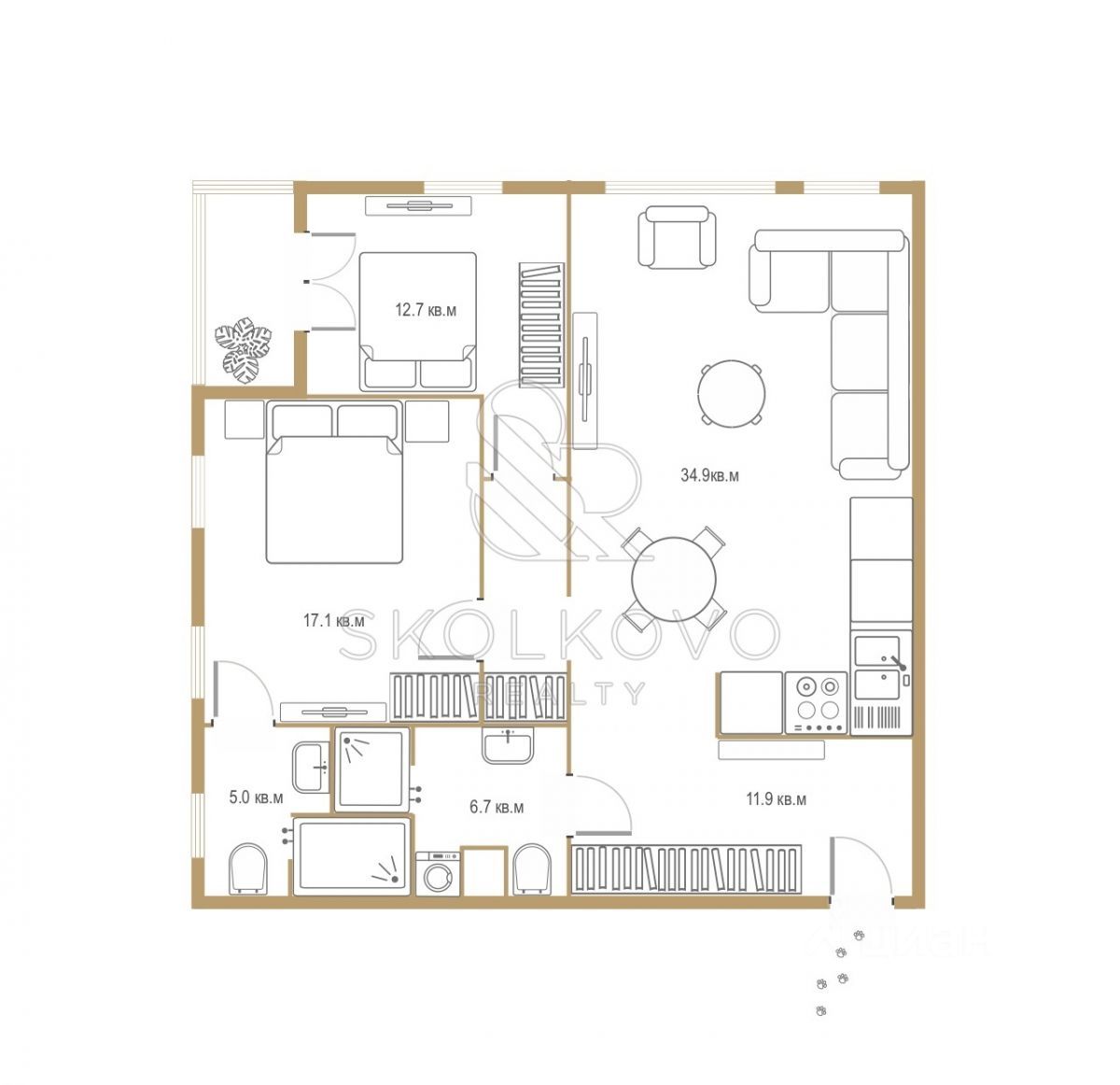 Просторная и уютная квартира с продуманной планировкой, включающая в себя кухню-гостиную, спальню с ванной, отдельную жилую комнату, совмещенный санузел, лоджию и прихожую.