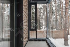 Фасад оформлен облицовочным камнем серых оттенков, а входные группы имеют дизайнерскую отделку.