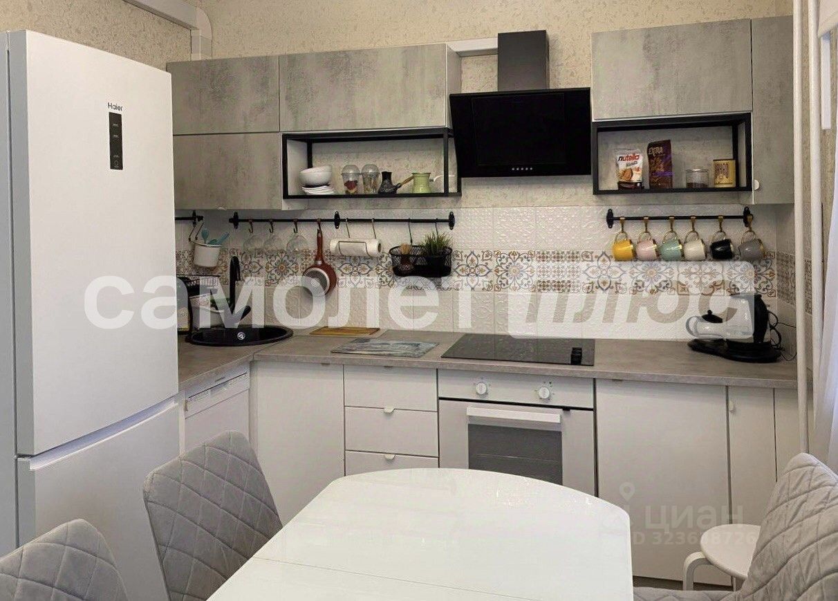 Кухня оснащена гарнитурной мебелью и всей необходимой посудой и техникой, включая холодильник, посудомоечную машину, чайник, варочную панель и духовой шкаф, так же обеденный стол.