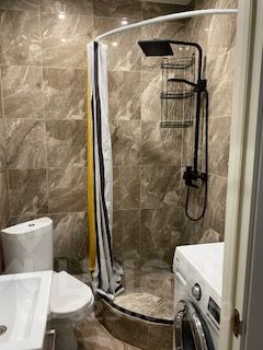 Студия светлая, тёплая, оборудована всем необходимым. В наличии: холодильник, стиральная машина, микроволновая печь, встроенная электрическая плита, вертикальный беспроводной пылесос, телевизор.