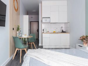 Студия располагается в современном жилом комплексе ЖК "М1 Сколково" с закрытой территорией, охраной, бесплатной парковкой открытого типа и консьержем.