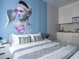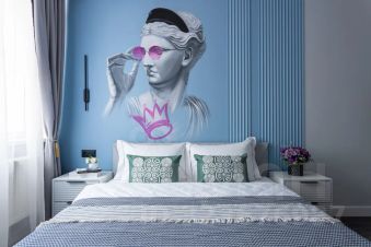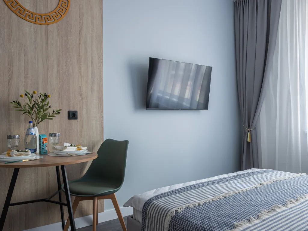 Каждая наша студия оформлена в неповторимом греческом стиле. Особенность интерьера — роспись ручной работы, посвященная одному из богов Олимпа. Это не просто место для проживания, это погружение в атмосферу мифов и эстетики.