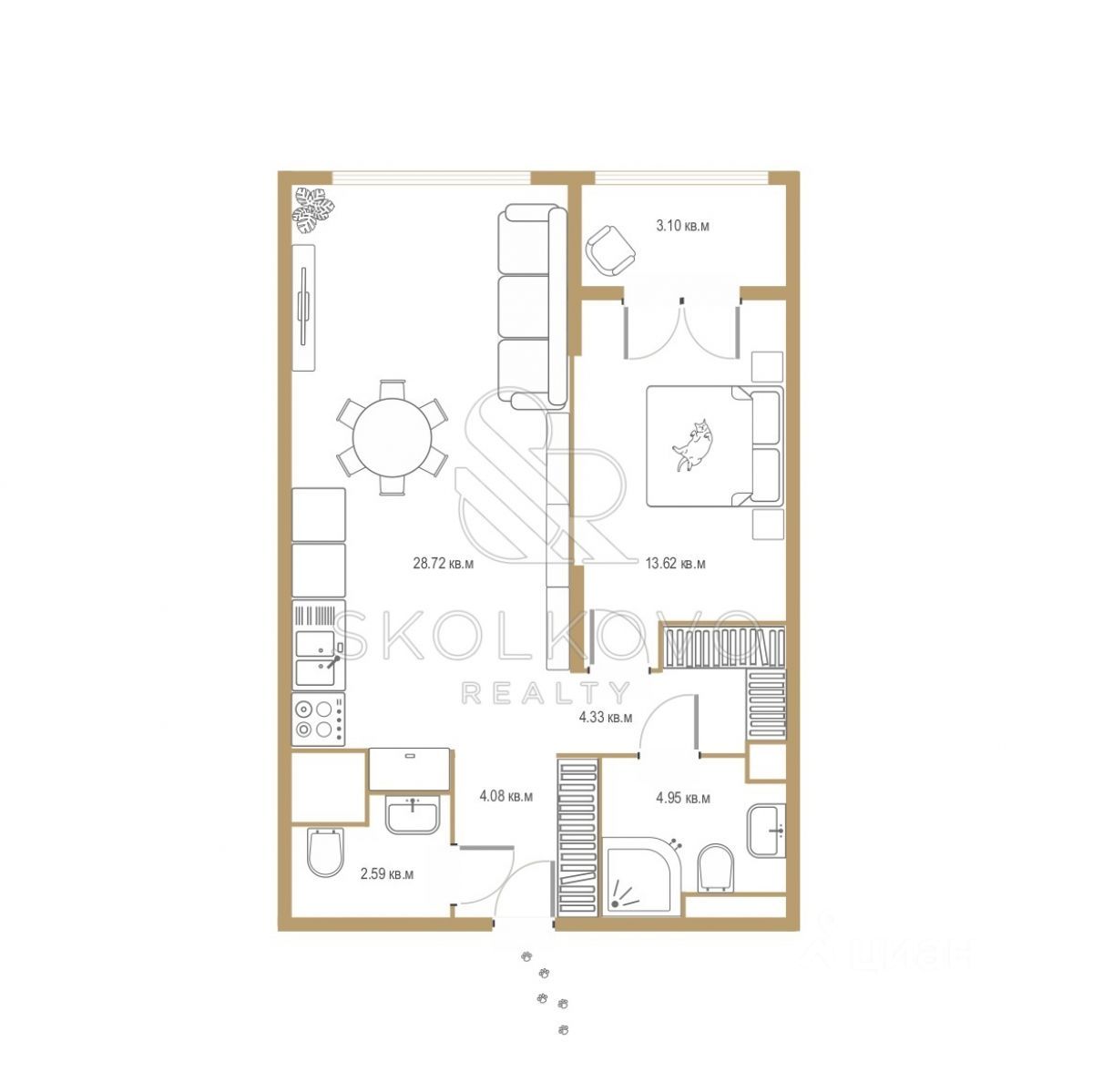 Планировка: кухня-гостиная, спальня, гардеробная, совмещенный санузел, лоджия, прихожая.