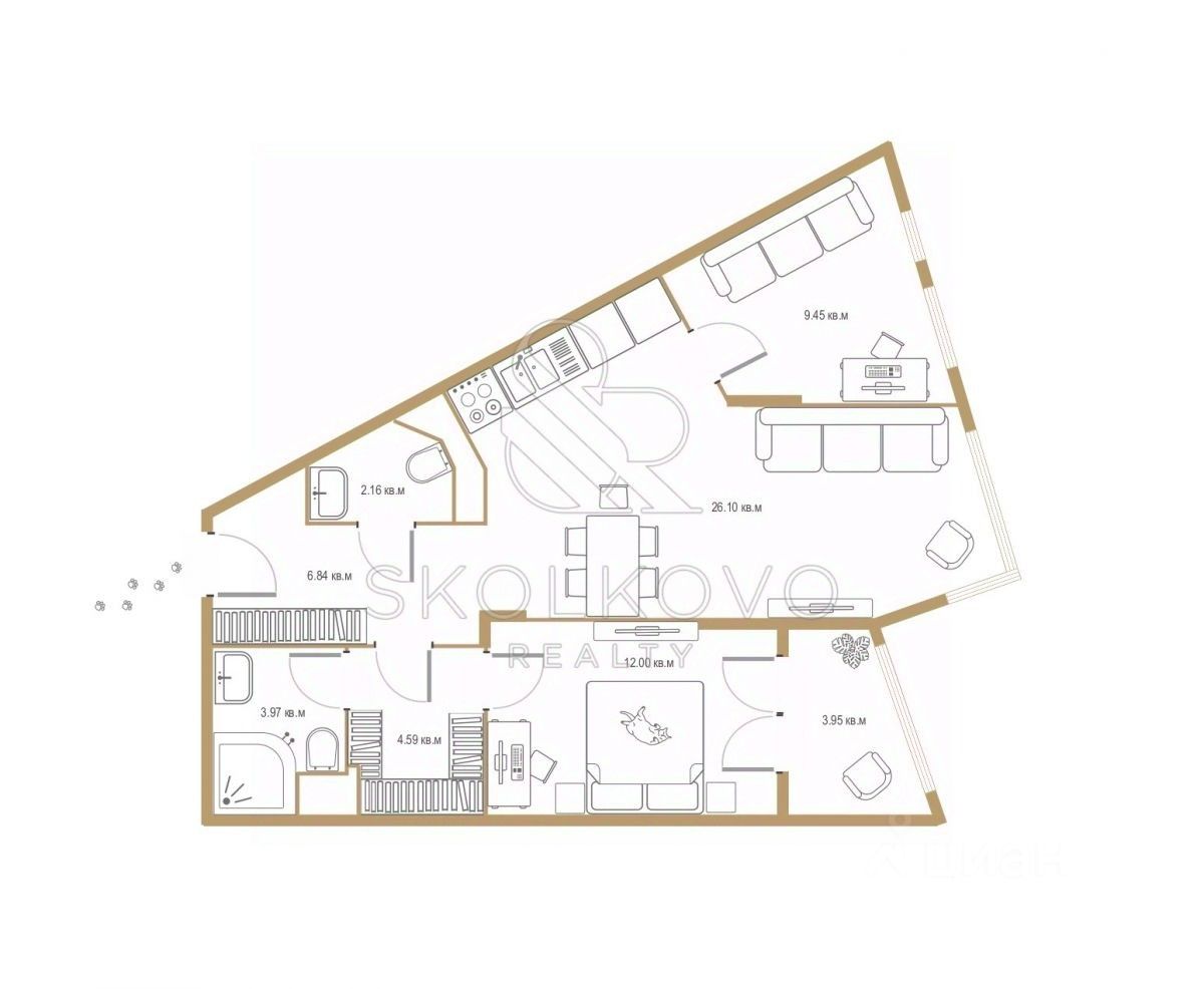 Планировка: кухня-гостиная, спальня, гардеробная, совмещенный санузел, кабинет, гостевой санузел, лоджия, прихожая.