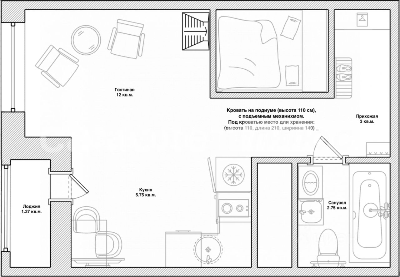 Студия оборудована необходимой мебелью два кресла, журнальный столик, обеденный стол, два стула. Двухспальная кровать расположена на подиуме высотой 110 см, под кроватью просторное место для хранения гардеробного типа, кухня оснащена гарнитурной мебелью и необходимой техникой, включая холодильник, микроволновую печь, чайник, варочную панель, вытяжкой и кондиционер. В ванной комнате установлена стиральная машина. Имеется складная сушка для белья.