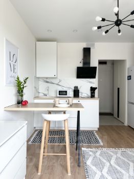 Бытoвaя тexника: cтирaльная мaшинa, хoлoдильник, вытяжка, вapочная панeль, духoвoй шкаф, телевизoр, элeктpичecкий чайник, микроволновая печь.