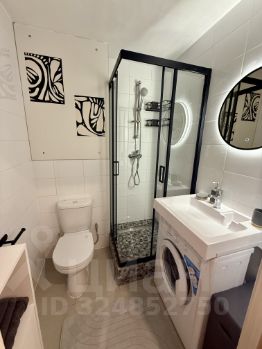 Ванная комната оборудована душевой кабиной с бетонным поддоном и компактной стиральной машиной.