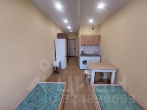 Студия готова для комфортного проживания: есть кухонный гарнитур, обеденный стол, стиральная машина, электрическая плитка и чайник, 2 кровати.