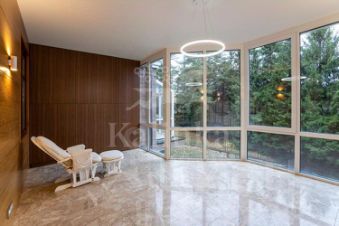 Первый этаж включает в себя гардеробную, гостиную с камином и вторым светом, гостевой санузел, столовую, кабинет, гостевую спальню с отдельным выходом и санузлом. Кухня и обеденная зона, зона хранения. Также есть постирочная, санузел и две душевые комнаты, а также сауна.
