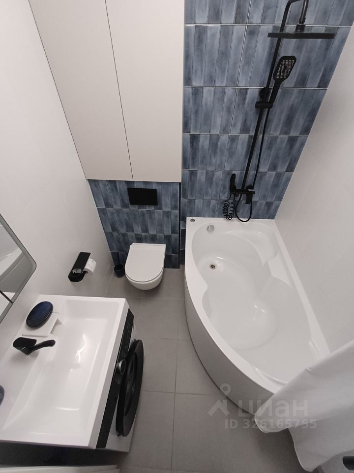 Полноценная угловая ванна 150 на 90см со шторой - можно не только принять душ, но и полежать в воде.