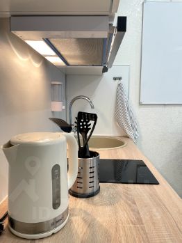 - Техника: холодильник, микроволновка, варочная панель, чайник, стиральная машина.