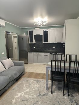 Из техники: 2-метровый вместительный холодильник Bosch, варочная панель, духовой шкаф, встроенная вытяжка, посудомоечная машинка, стиральная машина, телевизор, кондиционер. Также имеется сушилка для белья, гладильная доска.