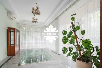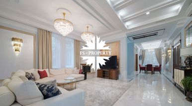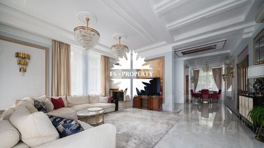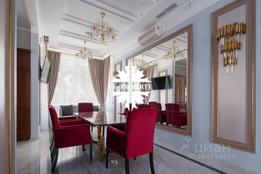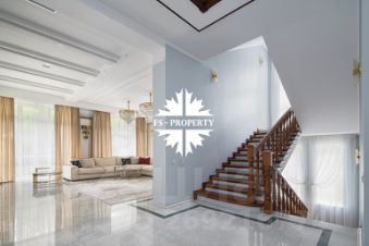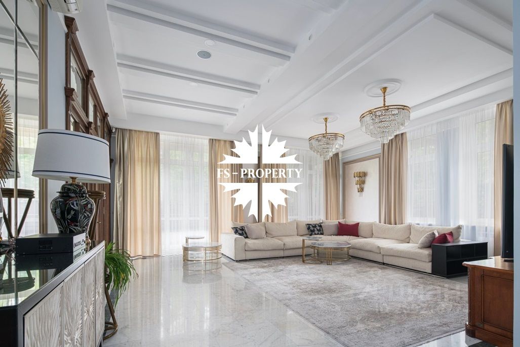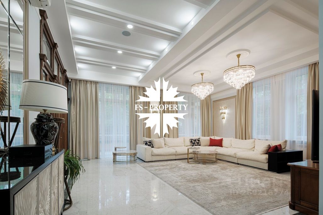 Отделка: мрамор, малахит, керамическая плитка, натуральное дерево. В доме мебель известных брендов (Финляндия, Италия, Англия). Полностью оборудована кухня: встроенные холодильник, микроволновка, духовой шкаф, винный шкаф. Покрытие поверхностей натуральный камень. Посередине кухни стол остров.