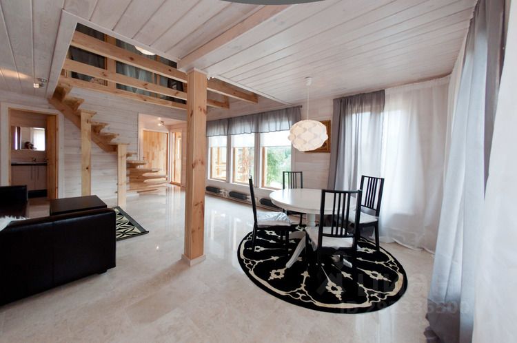 светлая кухня-гостиная с множеством окон в пол и прекрасными видами на лесной парк