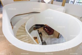 Полы первого этажа и ванных комнат выполнены из мрамора, как и ступени полувинтовой лестницы, ведущей на второй этаж. Двери, порталы и карнизы из массива лиственных пород выгодно выглядят в естественном освещении из панорамных деревянных окон. Дом просторный и светлый, он наполнен воздухом за счет высоких потолков и открытых пространств.