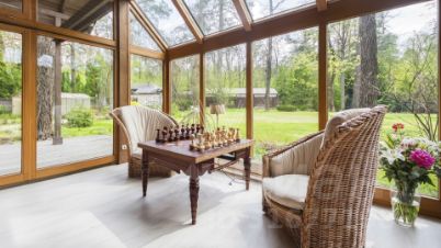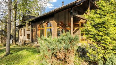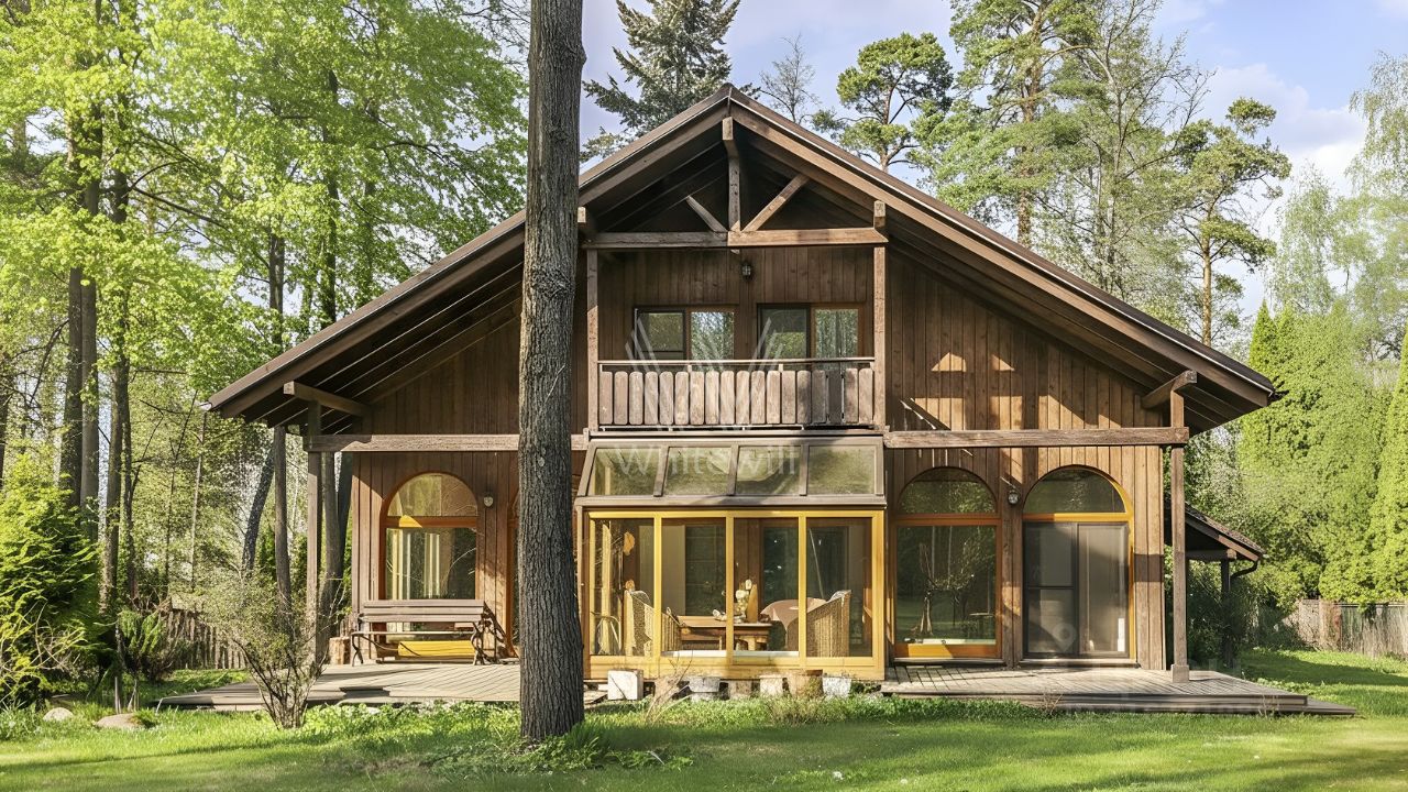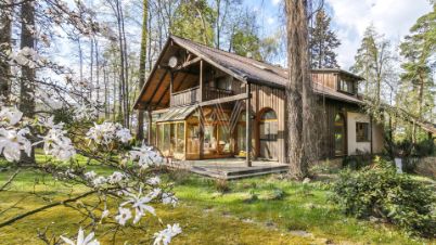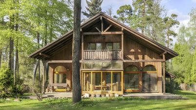 Жуковка-4. Загородный дом площадью 350 м² расположен на лесном участке 50 соток. Фасад выполнен в стиле шале и гармонично вписывается в природный ландшафт. Основной материал — дерево тёплого орехового цвета, текстура которого подчёркивается вертикальными планками. Деревянные колонны, балконы второго этажа и простая двускатная крыша дополняют образ, придавая зданию выразительность и завершенность.