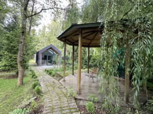 На участке высажены кустарники и крупномерные деревья, вымощены дорожки, установлено освещение и проведены ландшафтные работы.