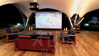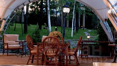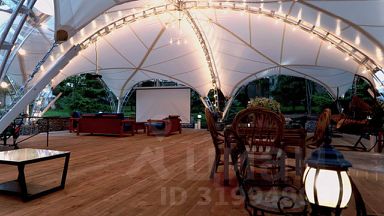 Обширная территория вокруг дома позволяет организовать мероприятия любого масштаба. На заднем дворе раскинулся элегантный шатер, идеальный для выездных церемоний или торжественных банкетов на свежем воздухе.