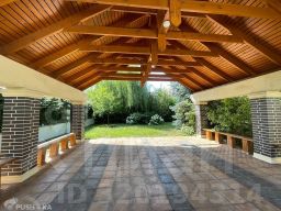 Участок прямоугольной формы, на нем расположены: крытая оборудованная беседка для барбекю, летняя веранда, площадка для спорта, высажены деревья и сосны, газон с автоматическим поливом, дренаж участка.