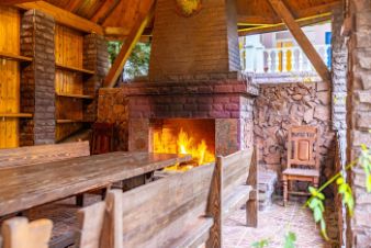 беседка из брёвен с уличным камином и большим столом,
