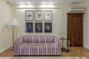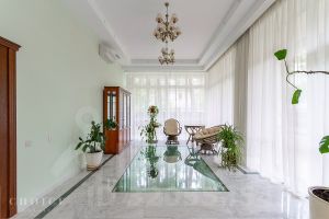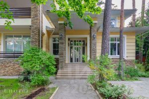 Комфортабельный и стильный проект для постоянного проживания. Оформление интерьеров проводилось с участием московских дизайнеров. На первом этаже полы белый мрамор и малахит. Подоконники белый мрамор. Полы в спальне 2-го этажа с водяным подогревом. Покрытие керамическая плитка под дерево. Во всех санузлах, на лестничных площадках, гостиной, столовой, кухне, зимнем саду, кинозале, бассейне полы также выполнены по технологии теплый пол, что обеспечивает комфорт и уют даже в сильные морозы. В остальных помещениях полы из натурального дерева. Двери, перегородки изготовлены из деревянного массива. В доме мебель известных брендов (Финляндия, Италия, Англия). Полностью оборудована кухня: встроенные холодильник, микроволновка, духовой шкаф, винный шкаф, посудомоечная машина. Покрытие поверхностей натуральный камень. Посередине кухни стол остров. В столовой большой стол из натурального камня и уютный уголок для отдыха. Общедомовая система приточно-вытяжной вентиляции с центральным увлажнителем воздуха и система вентиляции бассейна обеспечивают чистый и свежий лесной воздух. Подключены 2 телефонных номера МГТС, объединенные через цифровую АТС. В жилой дом и помещения персонала подведен Интернет. В доме имеется система акустического звуковоспроизведения по типу отеля с установкой потолочных динамиков внутри дома и уличных колонок снаружи.