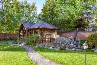 Видеонаблюдение по периметру участка. На участке - беседка, выполнен ландшафтный дизайн, освещение, кустарники. Гараж на 2 м/м+ парковка.