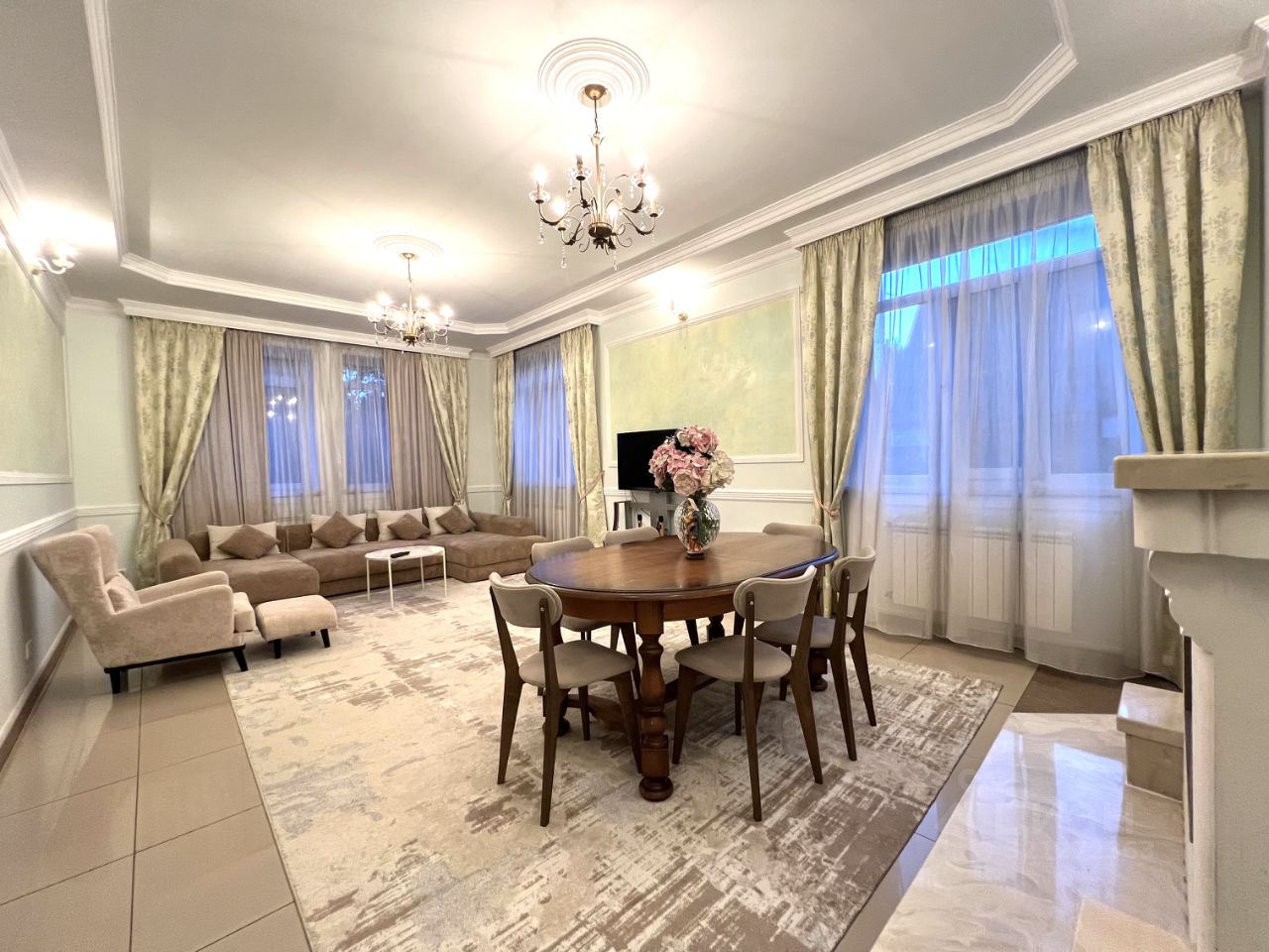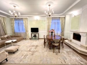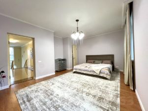 Первый этаж : гостиная с камином , кухня столовая, холл, санузел, спальня, котельная с газовым котлом полный автомат, профессиональная система очистки и смягчения воды, тамбур с выходом на задний двор. Полы весь этаж керамогранит с подогревом. Стены венецианская штукатурка и гипс. Потолки 3,5 м.