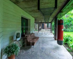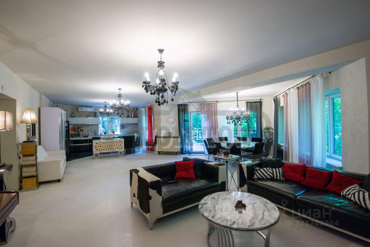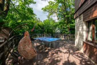 Гостиная банкетный зал 90 кв.м. на 30 персон с уютными диванчиками и большим телевизором. Зона кухни с необходимой посудой и техникой. Из гостиной есть выход на просторную террасу. На террасе расположена зона барбекю с садовой мебелью, мангалом и грилем; висит гамак, установлены садовые качели, теннисный стол. Спальни с балконами.