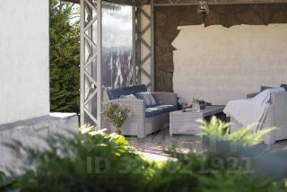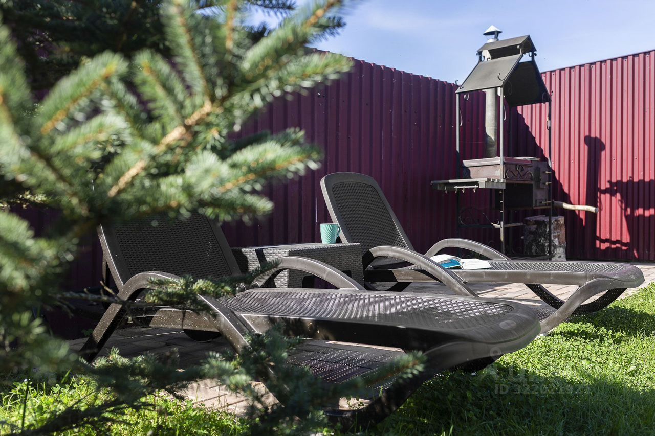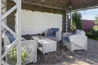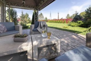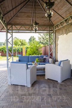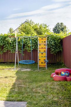 Просторная беседка с мягкими окнами и комфортной садовой мебелью. Барбекю-гриль на углях и мангал на дровах. Детская площадка, песочница, просторный и безопасный двор.