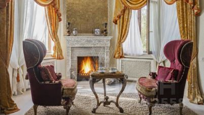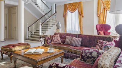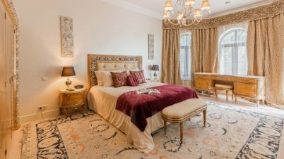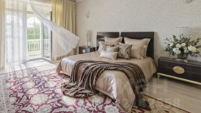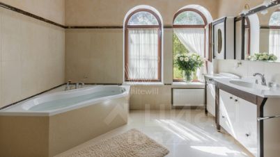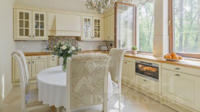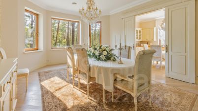 Николино. Загородный дом площадью 650 м² расположен на просторном участке 67 соток с лесными деревьями. Бежевый фасад здания выдержан в европейском стиле и декорирован арками. В оформлении интерьера преобладает классика, в отделке использованы теплые пастельные оттенки.