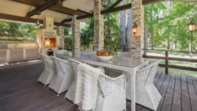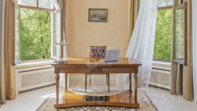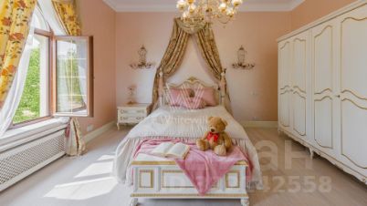 Планировка коттеджа включает четыре спальни, гостиную с камином, кухню, столовую с выходом на террасу и кабинет. На цокольном этаже находится спа-зона с хаммамом, сауной и комнатой отдыха. На участке выполнен ландшафтный дизайн, а также построены русская баня с гостевыми комнатами и гараж с квартирой для персонала.
