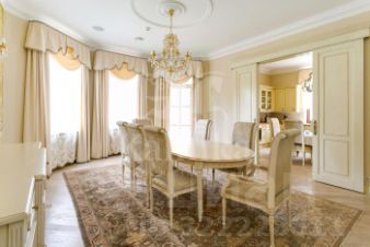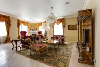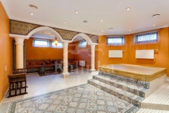 На участке - настоящая русская баня с гостевыми комнатами, отдельно стоящий гараж с квартирой для персонала. Земельный участок: 49 соток в собственности и 18 соток в долгосрочной аренде.