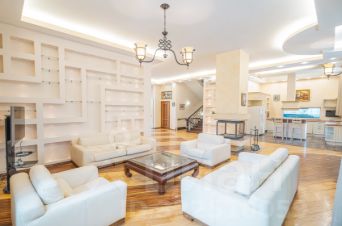 цокольный этаж: бильярдная, домашний кинотеатр, хамам, финская баня, тренировочный зал, погребок, постирочная. Коттедж полностью меблирован и оборудован современной техникой.