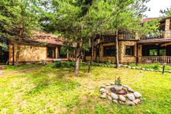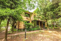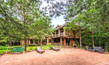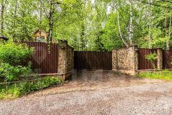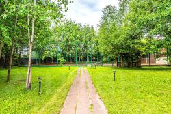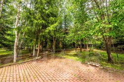 Участок с лесными и плодовыми деревьями, на участке дом для персонала, пруд, теннисный корт, беседка.
