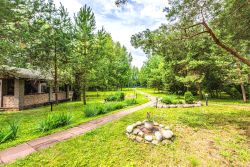 Загородный дом с бассейном на живописном лесном участке с ландшафтным дизайном.