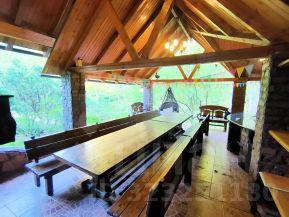 сердце участка: отдельно стоящая беседка из брёвен на 20 человек с оборудованной мангальной зоной и уличным камином (бесплатно выдаём шампуры, решётки, дрова и казан)