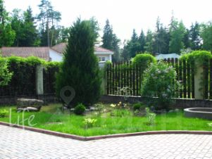 Участок правильной прямоугольной формы, с лесными деревьями. Выполнен ландшафтный дизайн, газон, декоративные деревья и кустарники. На территории расположена беседка барбекю.