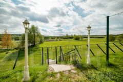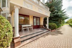 УЧАСТОК: красивая территория 80 соток с ландшафтным дизайном и множеством лиственных и хвойных деревьев. Вымощены дорожки, установлены фонари. Пруд с мостиком. Место для выездной регистрации, много фотозон. Теннисный корт с грунтовым покрытием. Множество декоративных элементов: альпийская горка, фонтан и др. Парковка на 20 автомобилей. Баня на дровах с видом на пруд.