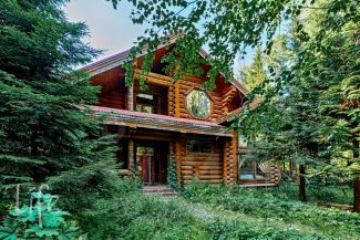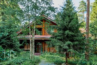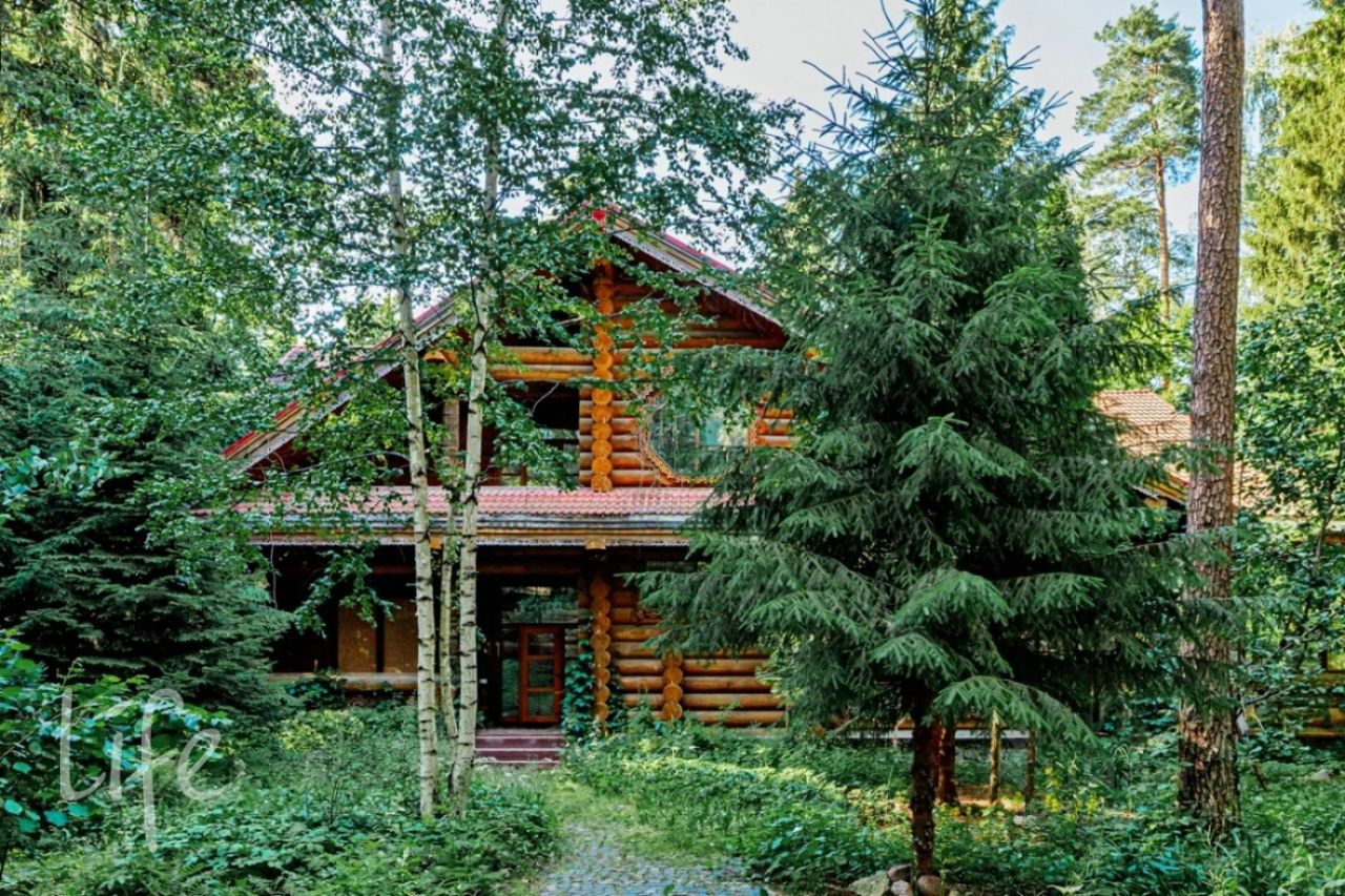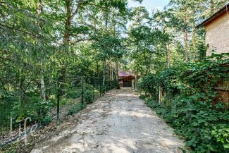Потрясающий лесной участок: вековые хвойные в сочетании с березками создают неповторимый сказочный уют. Дом как будто бы затерян в глубине участка, от гаража к нему ведет дорожка-тропинка.