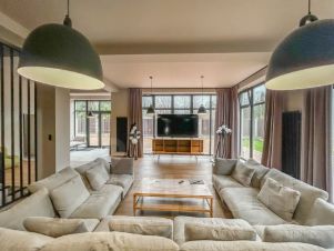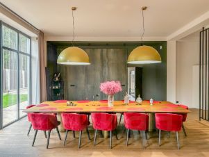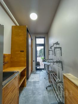 Прачечная комната, оборудованная стиральной и сушильной машинкой, сушильным шкафом (Asko), шкафом для хранения белья и моющих средств, парогенератором и гладильной доской.